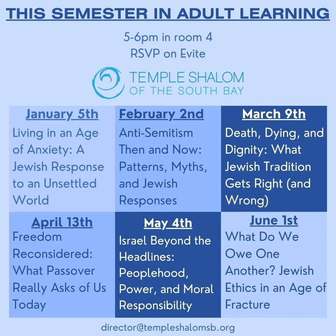 Jewish learning lasts a lifetime. Temple Shalom strives to be a learning congregation for all. Our Adult Education programs are designed to meet a variety of needs and interests for all members of our congregational family, from helping congregants gain basic skills and Judaic knowledge to providing topics of general Jewish interest. These classes are led by Rabbi August.